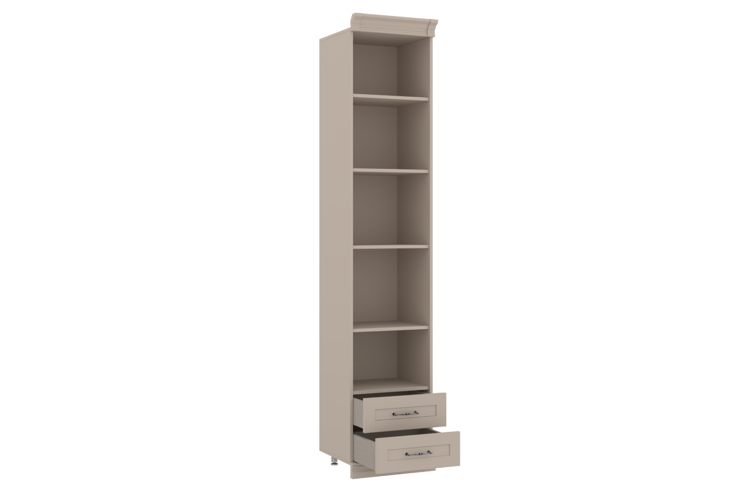 - Верхнее отделение — открытое (без фасада) с тремя съемными полками ЛДСП, в нижнем отделении — два выдвижных ящика;