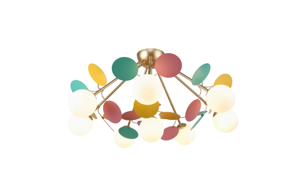 Multi Bliss поражает своим буйством красок и контрастом. Светильники из коллекции Multy Bliss чаще всего используют для детских комнат, чтобы создать уютную и игривую атмосферу. Декоративные круглые разноцветные пластины люстры и бра создают яркий и эффектный акцент в интерьере, придавая ему оригинальность и индивидуальность. Металлический каркас золотого цвета, круглые стеклянные плафоны молочного цвета, декоративные круглые разноцветные пластины, декоративные золотые шары, регулируемая высота.