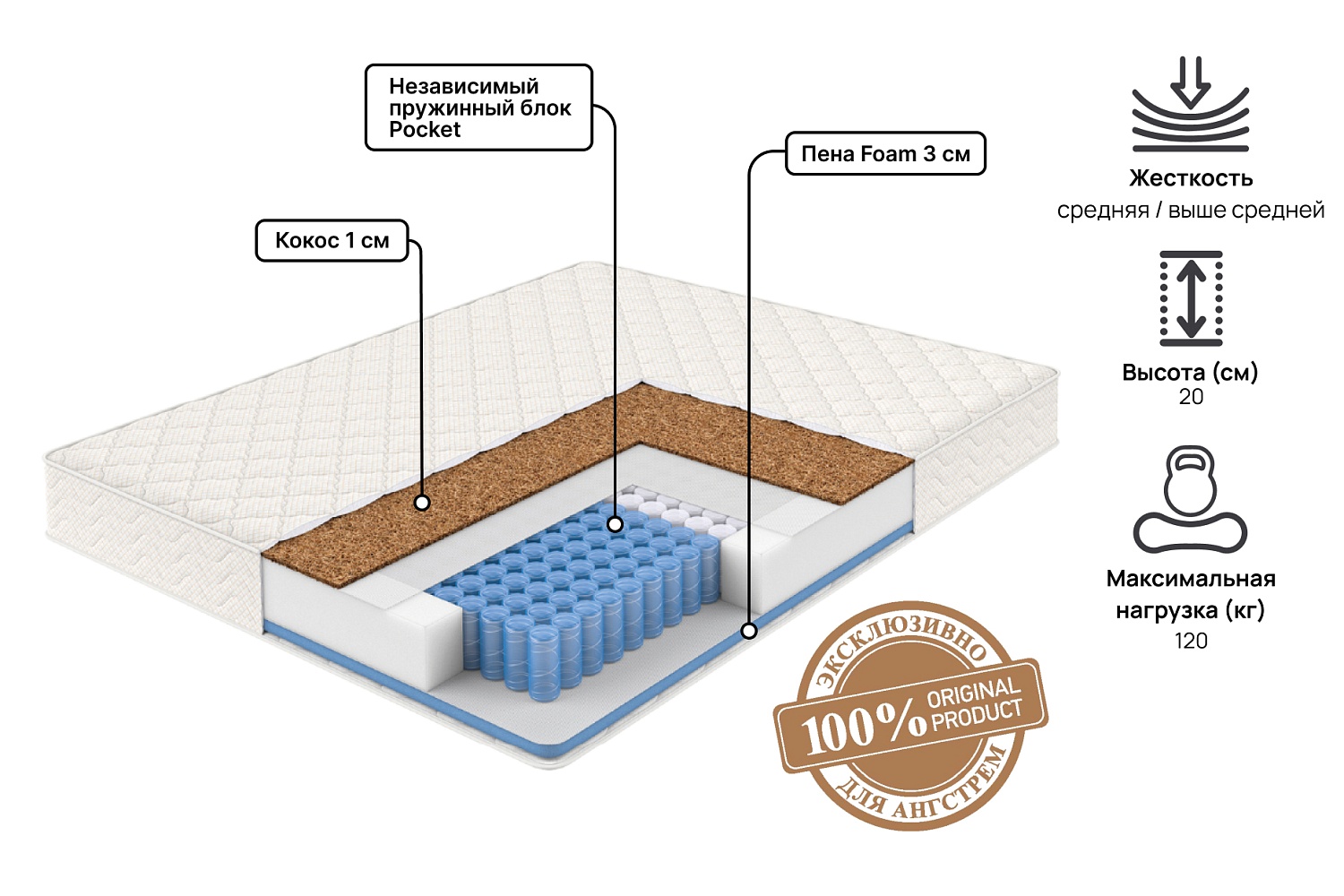 Блок независимых пружин Pocket, Высокоэластичная пена Foam, Кокос
